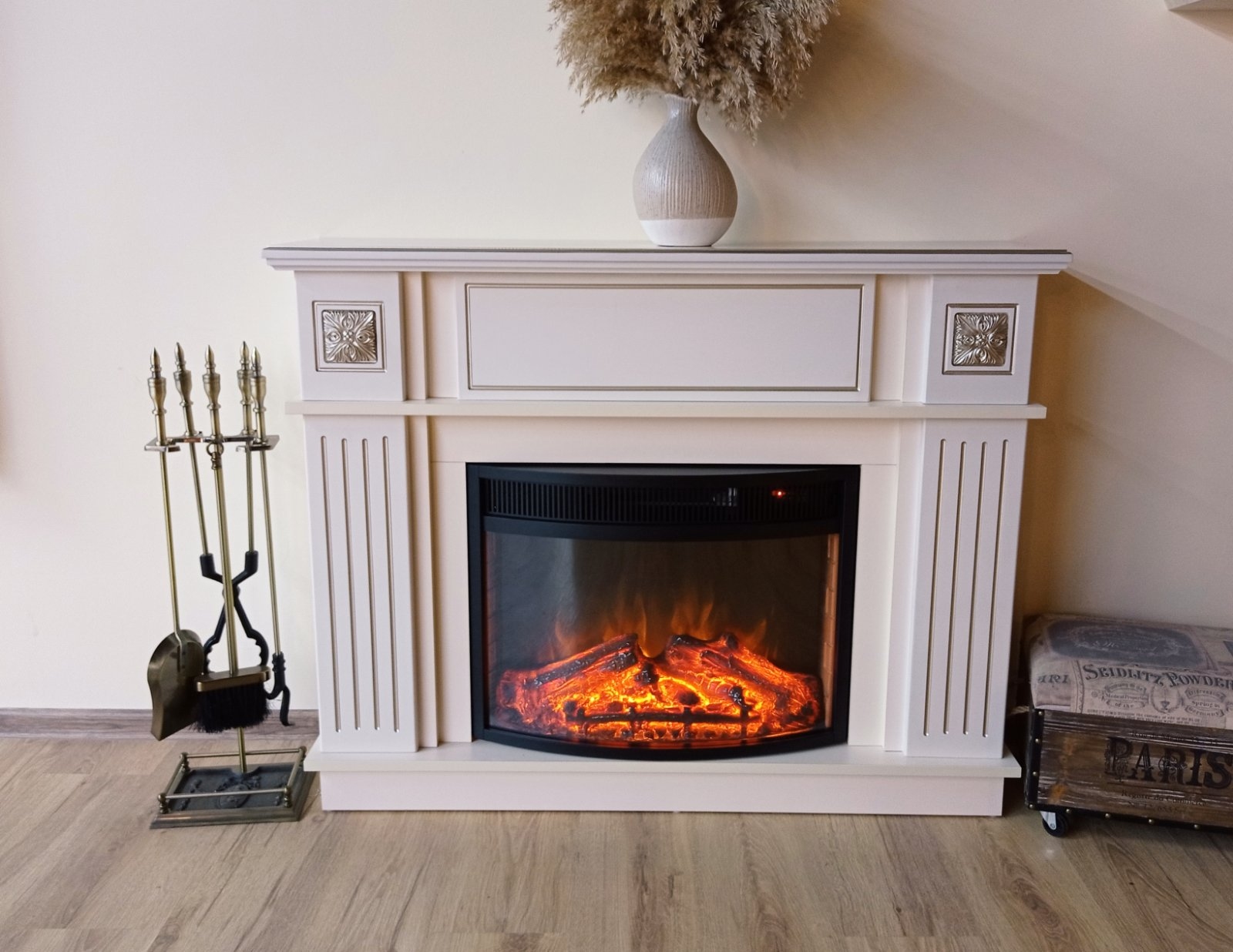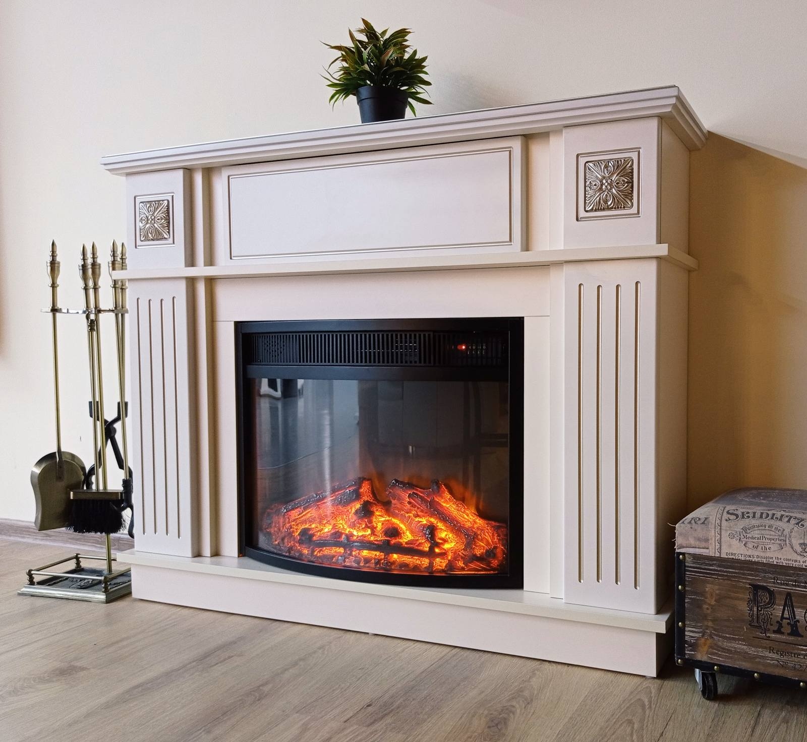 The Miracle & Zakynthos fireplace set will become the pearl of your home. Portal Miracle perfectly combines classic and modern styles. Made in jasmine color with cappuccino patina with elegant frame on the columns. A high-quality imitation of the Zakynthos electric fireplace flame will give you a great feeling of comfort. The functionality of this model allows you to use the flame simulation mode separately from the heating mode, it has a remote control panel and an auto-off timer.