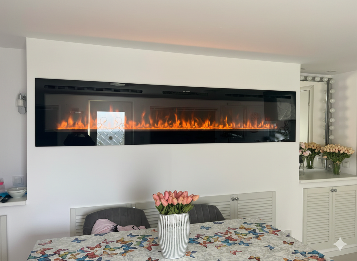 The fireplace is over 2.5 meters long! Despite its size, it consumes the same amount of electricity as representatives of smaller sizes. The color of the flame can be adjusted according to the desire and mood of the client, as well as the brightness. The combination of crystals and smoldering logs amazes with its grace and beauty!